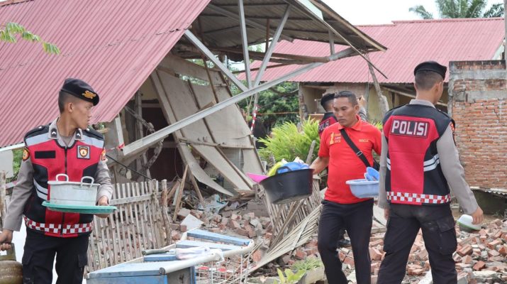 Menanggapi kondisi itu, Polri melalui Dit Samapta Polda Bengkulu bergerak cepat memberikan bantuan kemanusiaan dengan mengerahkan personel untuk membantu proses pembersihan material bangunan yang runtuh.
