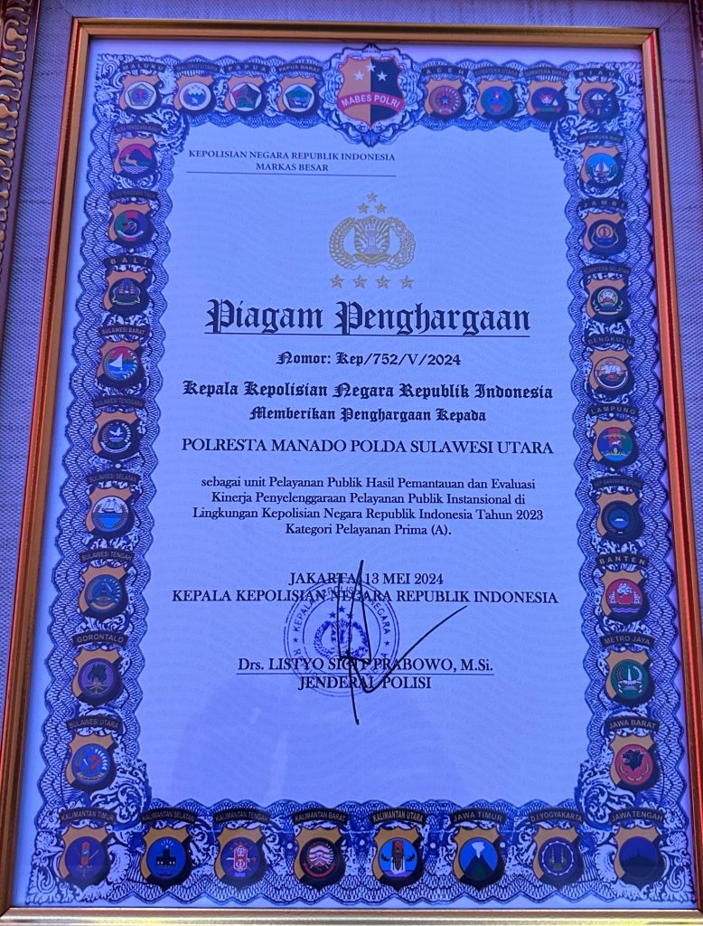 MANADO, Humas Polresta Manado- Kepolisian Resor Kota (Polresta) Manado, di bawah naungan Polda Sulawesi Utara, kembali menorehkan prestasi membanggakan di tingkat nasional. Kali ini, Polresta Manado dianugerahi Piagam Penghargaan dari Kepala Kepolisian Negara Republik Indonesia sebagai Unit Pelayanan Publik dengan Kategori Pelayanan Prima (A) berdasarkan hasil Pemantauan dan Evaluasi Kinerja Penyelenggaraan Pelayanan Publik Mandiri Tingkat Polri Tahun 2024, Kamis (19/6/2025).
