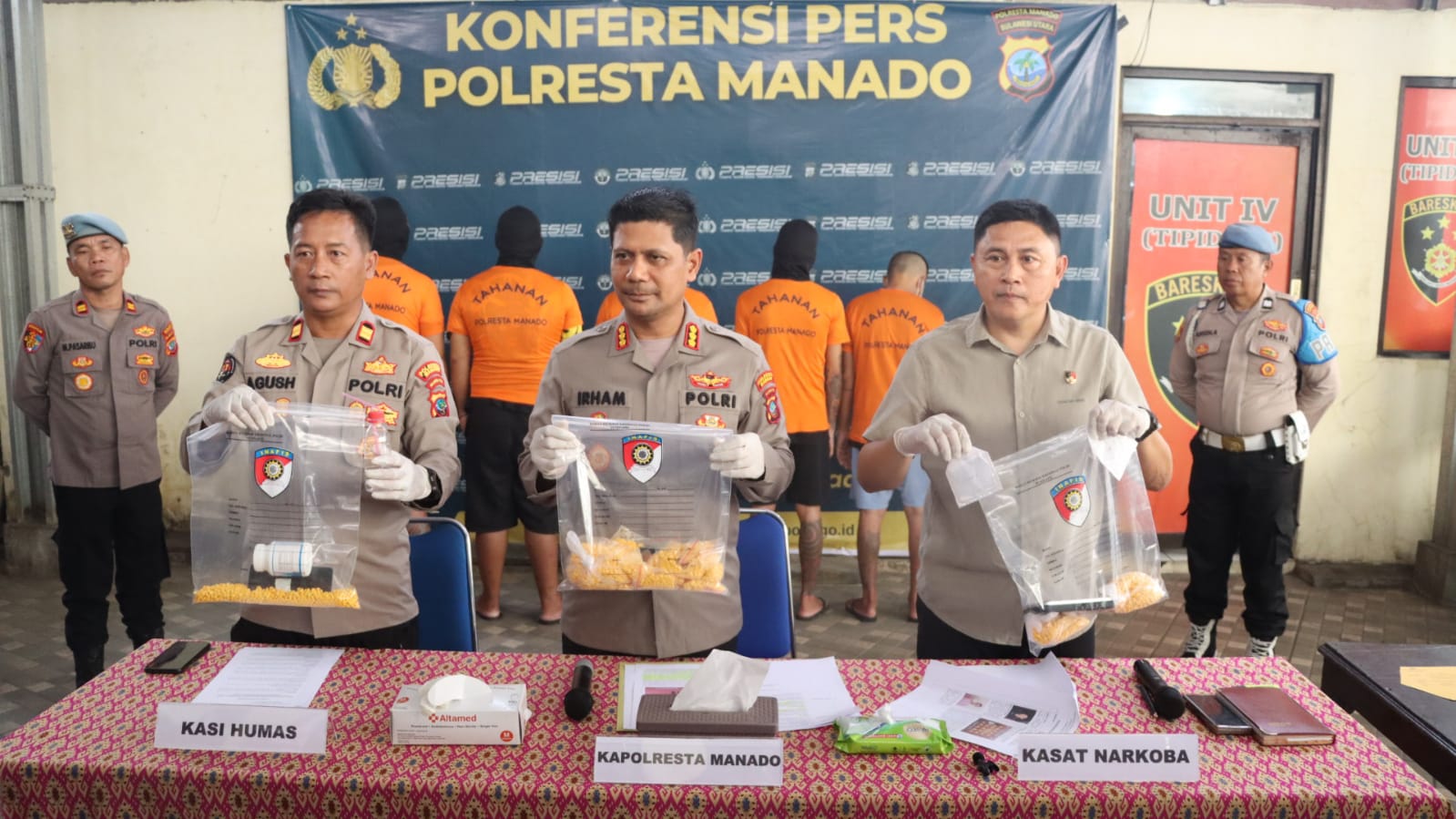 Kegiatan ini turut dihadiri oleh Kasat Resnarkoba AKP Hilman Muthalib, dan Kasi Humas Polresta Manado IPTU Agus Haryono. Dalam press release yang dilaksanakan di Mapolresta Manado tersebut, disampaikan bahwa jajaran Satres Narkoba telah berhasil mengungkap lima kasus, yang terdiri dari empat kasus peredaran obat keras jenis Trihexyphenidyl dan satu kasus narkotika jenis sabu.