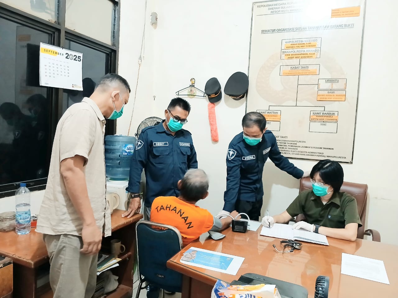 Pemeriksaan kesehatan (Rikes) meliputi pengecekan tekanan darah serta penanganan terhadap tahanan yang mengalami keluhan kesehatan. Kegiatan tersebut dilakukan langsung oleh dr. Agnesia Moningka bersama anggota Sidokkes Polresta Manado.
