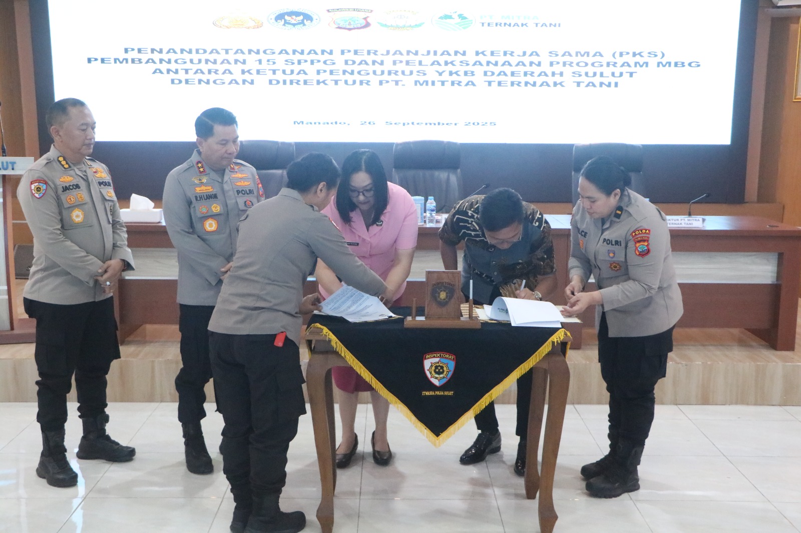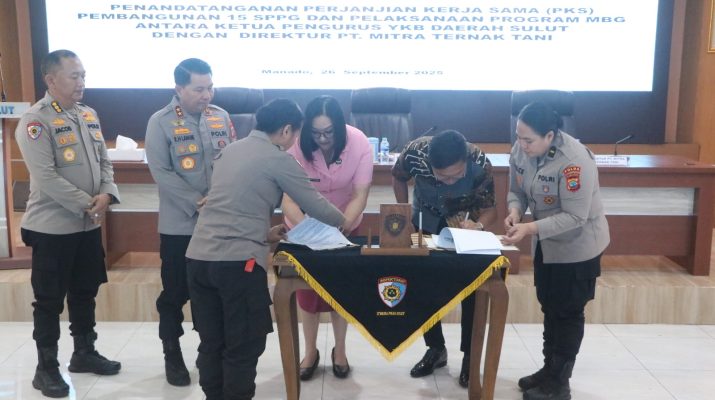 MANADO, Humas Polresta Manado- Yayasan Kemala Bhayangkari (YKB) Daerah Sulawesi Utara (Sulut) dan PT Mitra Ternak Tani menandatangani perjanjian kerja sama tentang pembangunan 15 Satuan Pelayanan Pemenuhan Gizi (SPPG) dan pelaksanaan program Makan Bergizi Gratis (MBG), Jumat (26/9/2025), di ruang Tribrata Mapolda Sulut.