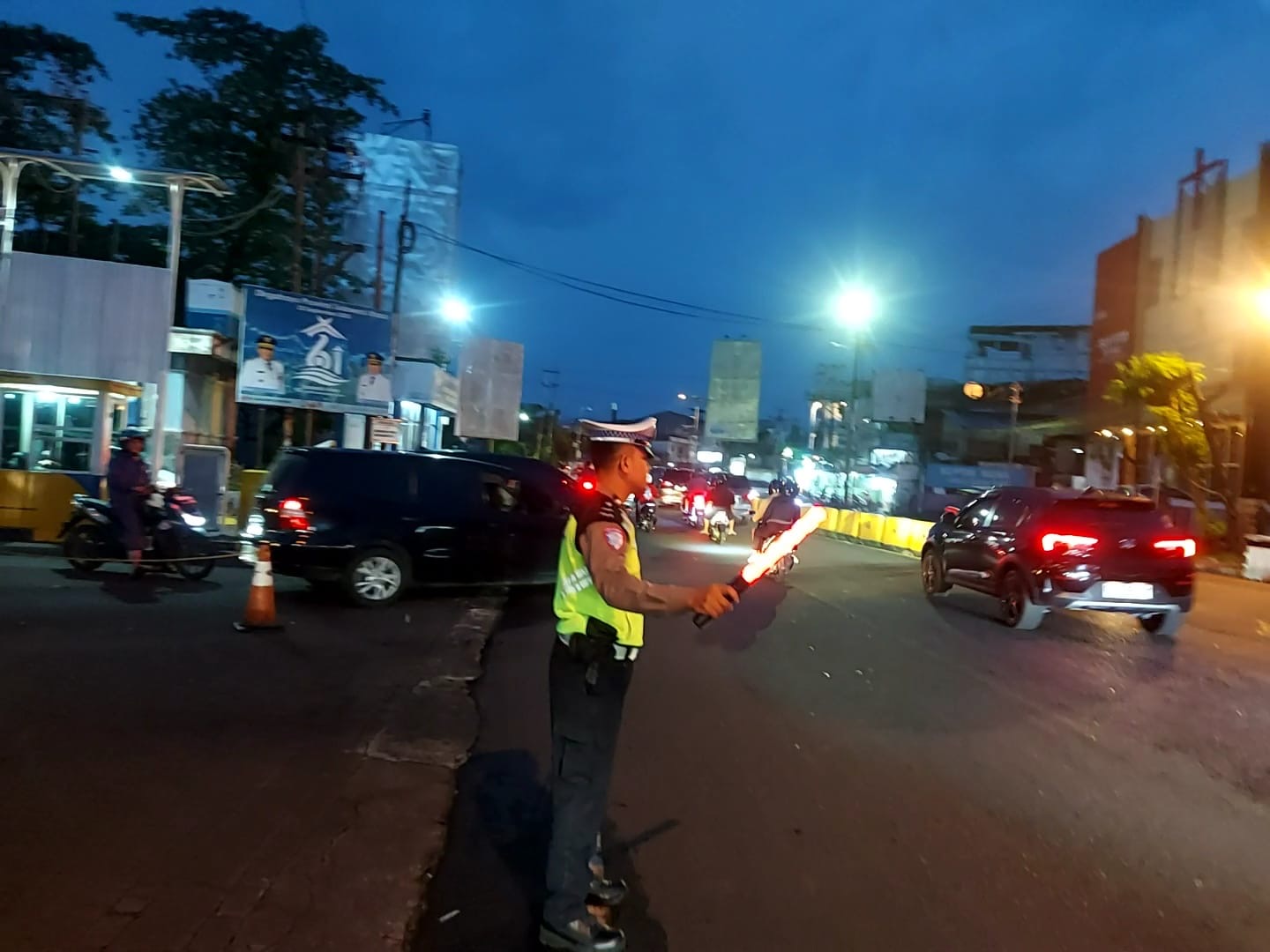 Selain mengatur lalu lintas, petugas juga memberikan imbauan kepada pengendara agar mematuhi aturan lalu lintas, menggunakan helm, dan tidak melawan arus.