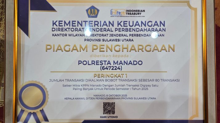 MANADO, Humas Polresta Manado – Polresta Manado kembali menorehkan prestasi membanggakan di tingkat nasional. Kali ini, satuan kerja (satker) di bawah Polda Sulawesi Utara tersebut berhasil meraih piagam penghargaan dari Kementerian Keuangan RI, Direktorat Jenderal Perbendaharaan Kantor Wilayah Provinsi Sulawesi Utara, Rabu (8/10/2025).