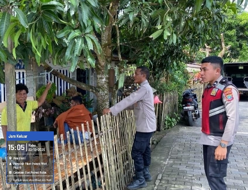 MANADO, Humas Polresta Manado – Personel Polsek Wori, Polresta Manado, melaksanakan kegiatan patroli rutin kewilayahan di wilayah hukumnya pada Rabu (22/10/2025) sore. Kegiatan yang berlangsung mulai pukul 15.00 hingga 16.00 Wita tersebut menyasar sejumlah titik di Desa Kima Bajo, Kecamatan Wori.