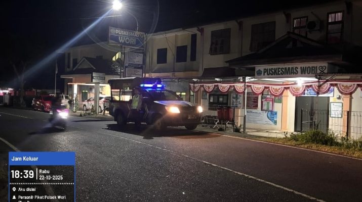 MANADO, Humas Polresta Manado – Personel Polsek Wori, Polresta Manado, melaksanakan kegiatan patroli “Silau Mata” untuk mengantisipasi potensi gangguan keamanan dan ketertiban masyarakat (kamtibmas) di wilayah hukumnya. Patroli ini digelar pada Rabu (22/10/2025) pukul 18.00 hingga 19.00 Wita di sepanjang Jalan Raya Wori-Manado, Kecamatan Wori, Kabupaten Minahasa Utara.