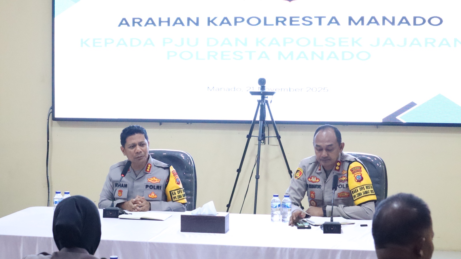MANADO, Humas Polresta Manado – Kapolresta Manado Kombes Pol Irham Halid memberikan arahan kepada para Pejabat Utama (PJU) dan Kapolsek jajaran dalam kegiatan internal yang digelar di Mapolresta Manado. Dalam arahannya, Irham menekankan pentingnya peningkatan kinerja, respons cepat, dan pelayanan publik yang lebih humanis, Jumat (21/11/2025).
