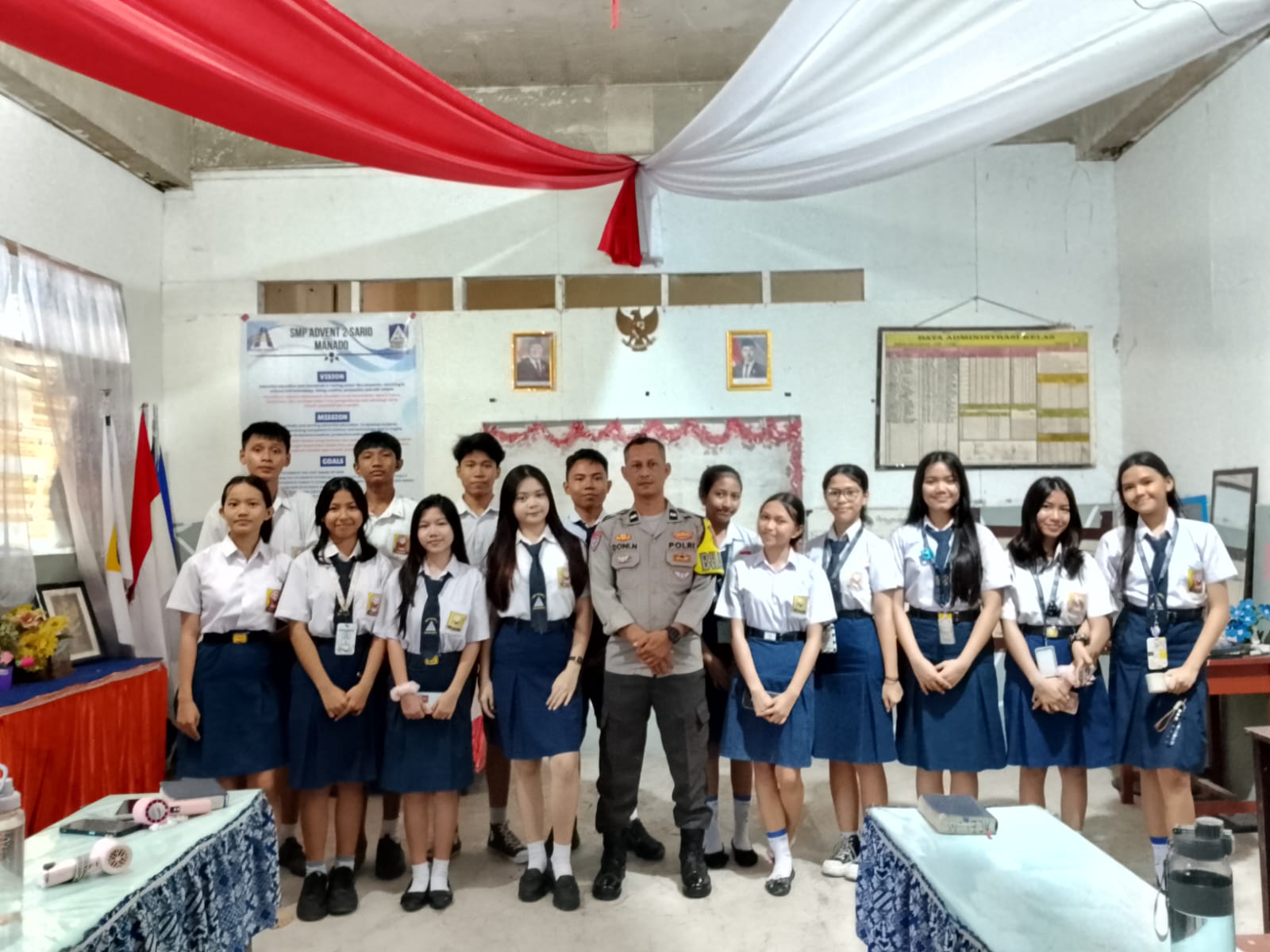 MANADO, Humas Polresta Manado – Bhabinkamtibmas Kelurahan Sario Tumpaan Aipda Doni Nugroho bersama personel SDM Polresta Manado menggelar sosialisasi sekaligus pendampingan pendaftaran Sistem Penerimaan Murid Baru (SPMB) Tahun Ajaran 2026/2027 SMA Kemala Taruna Bhayangkara. Kegiatan berlangsung di SMP Advent 2 Sario Manado pada Jumat (21/11/2025) sekitar pukul 10.30 Wita.