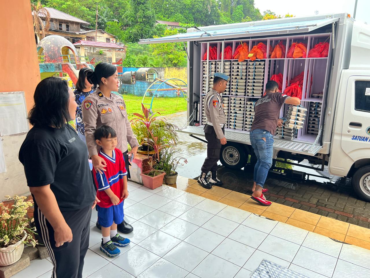 Personel Polsek Wanea tampak melakukan pengamanan di setiap titik sekolah untuk memastikan kegiatan berlangsung tertib, aman, dan lancar. Selain itu, polisi juga membantu mengatur alur distribusi agar pembagian berjalan efektif tanpa menimbulkan kerumunan.