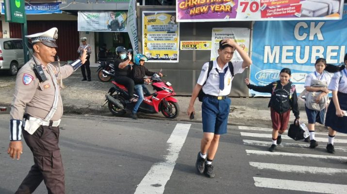 Dalam kegiatan tersebut, seorang petugas tampak turun langsung ke tengah jalan mengatur arus kendaraan dan membantu para siswa yang hendak menyeberang di area zebra cross. Sejumlah anak berseragam sekolah terlihat diarahkan dengan aman melewati jalan yang ramai, sementara kendaraan bermotor diminta memperlambat laju.
