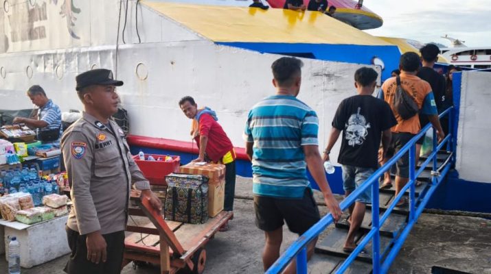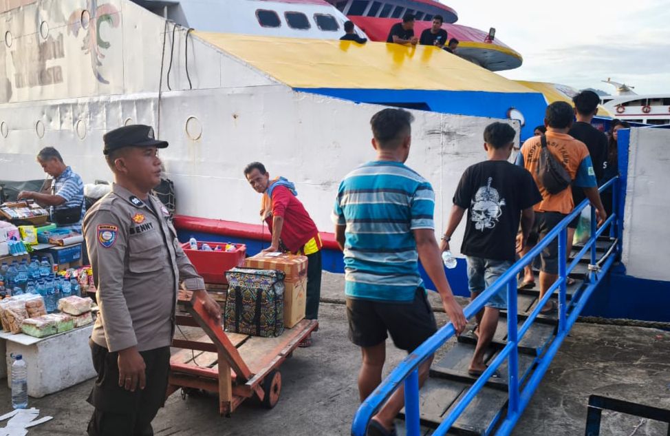 Petugas terlihat menyusuri dermaga, area tunggu, hingga pintu masuk kapal sambil melakukan pemeriksaan situasi dan memberi imbauan kamtibmas kepada calon penumpang. Arus penumpang yang meningkat membuat pengawasan diperketat, baik dari sisi keamanan, keselamatan, maupun ketertiban.